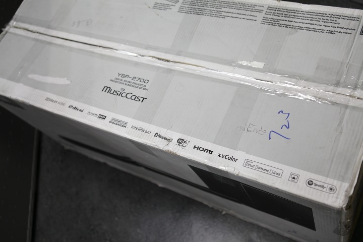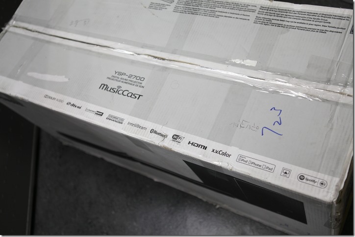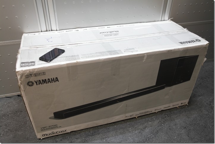 ▲當體驗產品 YSP-2700 組合送到時,著實嚇了一大跳!真是個龐然大物呢~上頭的 iPhone 5 當一下比例尺,真的蠻大一件,需要專車貨運才行。