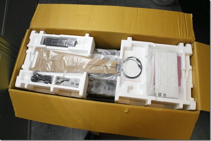 ▲包裝開箱,滿滿的內容物,首先映入眼簾的有YSP-2700 Soundbar本體跟重低音喇叭本體、遙控器、說明書及硬紙板麥克風架、麥克風、光纖線等等。