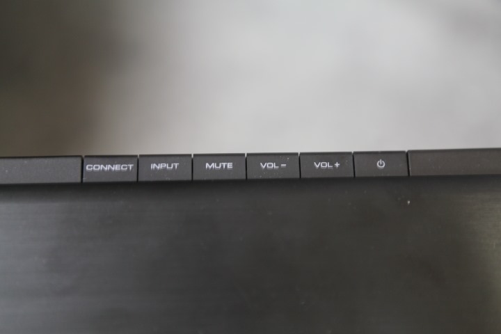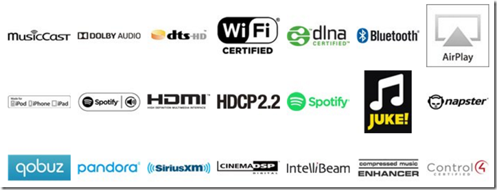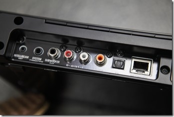 ▲背面的訊號輸入、輸出接頭,最左邊是 INTELLIBEAM 麥克風連結插孔,由左至右依序兩種重低音輸出,AUX 立體聲輸出、同軸、數位光纖輸入、RJ-45 網路孔。HDMI一組 ARC 輸出、三組輸入,支援 HDR、HDCP2.2,USB 孔僅供韌體升級專用,一般狀況無法使用。機殼背後明顯標示:支援 INTELLIBEAM 麥克風插孔、CINEMA DSP、dts HD、DOLBY AUDIO、Bluetooth、WiFi、HDMI 等規格。